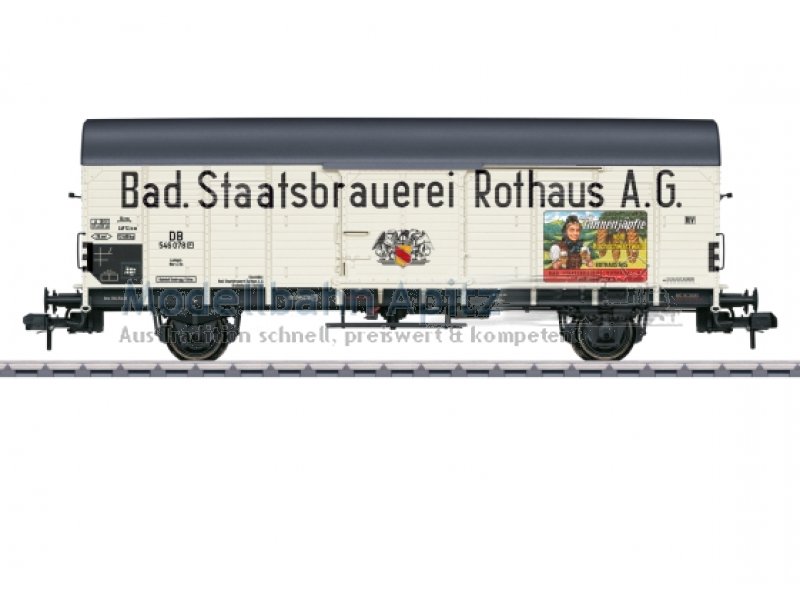 Vorbild: Privater, gedeckter Güterwagen der Verbandsbauart Gl 11 im Zustand der Epoche III mit Werbebeschriftung der Bad. Staatsbrauerei Rothaus AG, eingestellt bei der Deutschen Bundesbahn (DB) Ausführung ohne Handbremse. Modell: Wagen in aufwendiger Farbgebung, anlässlich des 70-jährigen Jubiläums der Biermarke Tannenzäpfle der Bad. Staatsbrauerei Rothaus AG. Langer Wagenkasten mit Tonnendach und Nachbildung der Bretterwände. Türen zum Öffnen. Viele angesetzte Details. Hochwertige Farbgebung und Beschriftung. Befahrbarer Mindestradius 1.020 mm.Länge über Puffer 37,5 cm.