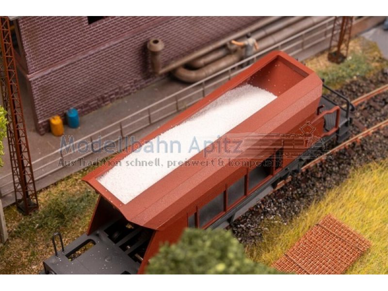 Die Farbgebung und Körnung sind hervorragend geeignet, um Kalk zu imitieren. Ideal zur realistischen Ausgestaltung von Industrie- und Verladezonen im Modellbau. Auch perfekt für Halden, Ladebereiche oder Förderanlagen. Für alle gängigen Spurweiten geeignet.