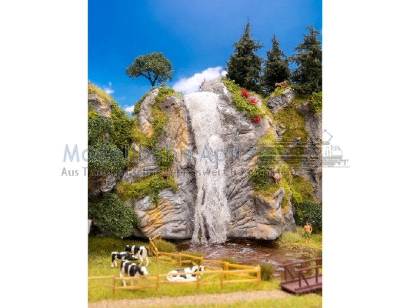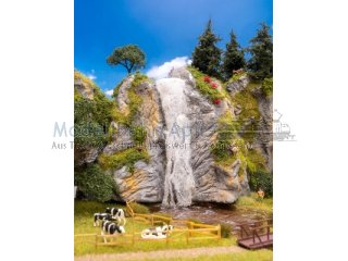 Zwischen den hellen, schroffen Felswänden bahnt sich ein dünner Wasserfall seinen Weg ins Tal. Dieses detailreiche Felsmodul mit Wasserfall bringt Stimmung in die Modelllandschaft und eignet sich ideal als Blickfang in Gebirgszügen, Schluchten oder verwunschenen Waldecken. Ein kleines Naturspektakel für den Modellbau.