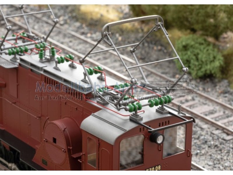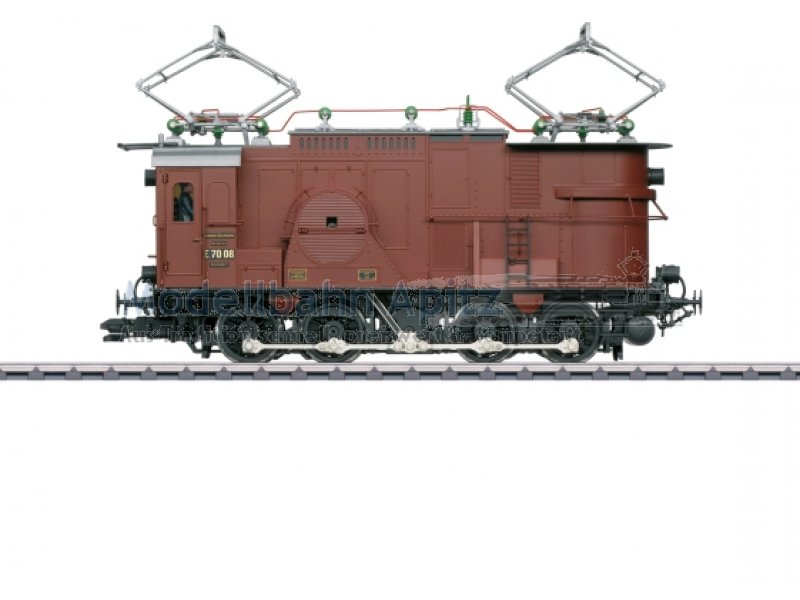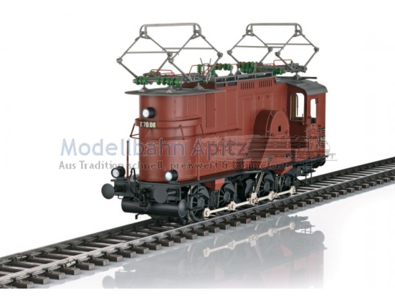 Vorbild: Nahverkehr Güterzug-Elektrolokomotive E 70 08 der Deutschen Reichsbahn Gesellschaft (DRG) Ep. II. Modell: Komplett neu konstruiertes Modell. Fahrgestell mit Hauptrahmen aus Zinkdruckguss, Lokaufbau aus Messingblech. Ansetzteile aus Messing-Schleuderguss. Mit mfx Digital-Decoder und 32 Funktionen, Stromspeicher parametrisierbar. Antrieb auf alle Achsen. Umfangreichen Sound- und Lichtfunktionen. Betrieb mit Wechselstrom, Gleichstrom, Märklin Digital und DCC möglich. Zentral eingebauter Hochleistungsmotor mit Antrieb auf alle Achsen. Im Digitalbetrieb motorisch heb- und senkbarer, vorbildgerechter Scherenstromabnehmer. Weißes 2-Licht-Spitzensignal mit LEDs im Wechsel mit rotem Schlusslicht, digital schaltbar. Zugbegegnungslicht schaltbar. Warmweiße LED-Beleuchtung im Führerstand. Fahrpulte beleuchtet. Führerstandstüren zum Öffnen, Aufwendige Nachbildung der Inneneinrichtung, Führerstand mit eingebauter Lokführerfigur. Griffstangen aus Metall und viele weitere angesetzte Details wie: Schilder, Pfeife u.a. Pufferbohlen mit Federpuffern und angesetzten Bremsleitungen. Hinten serienmäßig montierte, fernbedienbare Telexkupplung hinten gegen beigefügte Schraubenkupplungen austauschbar. Vorne vorbildgerechte Schraubenkupplung. Telexkupplung für vorn im Lieferumfang. Befahrbarer Mindestradius 1.020 mm. Länge über Puffer 31,3 cm. Gewicht ca. 3 Kg.