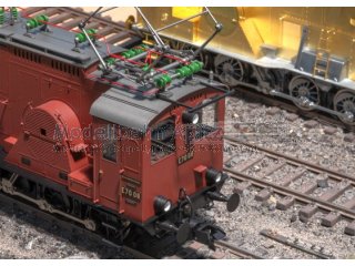 Modell: Komplett neu konstruiertes Modell. Fahrgestell mit Hauptrahmen aus Zinkdruckguss, Lokaufbau aus Messingblech. Ansetzteile aus Messing-Schleuderguss. Mit mfx Digital-Decoder und 32 Funktionen, Stromspeicher parametrisierbar. Antrieb auf alle Achsen. Umfangreichen Sound- und Lichtfunktionen. Betrieb mit Wechselstrom, Gleichstrom, Märklin Digital und DCC möglich. Zentral eingebauter Hochleistungsmotor mit Antrieb auf alle Achsen. Im Digitalbetrieb motorisch heb- und senkbarer, vorbildgerechter Scherenstromabnehmer. Weißes 2-Licht-Spitzensignal mit LEDs im Wechsel mit rotem Schlusslicht, digital schaltbar. Zugbegegnungslicht schaltbar. Warmweiße LED-Beleuchtung im Führerstand. Fahrpulte beleuchtet. Führerstandstüren zum Öffnen, Aufwendige Nachbildung der Inneneinrichtung, Führerstand mit eingebauter Lokführerfigur. Griffstangen aus Metall und viele weitere angesetzte Details wie: Schilder, Pfeife u.a. Pufferbohlen mit Federpuffern und angesetzten Bremsleitungen. Hinten serienmäßig montierte, fernbedienbare Telexkupplung hinten gegen beigefügte Schraubenkupplungen austauschbar. Vorne vorbildgerechte Schraubenkupplung. Telexkupplung für vorn im Lieferumfang. Befahrbarer Mindestradius 1.020 mm. Länge über Puffer 31,3 cm. Gewicht ca. 3 Kg.