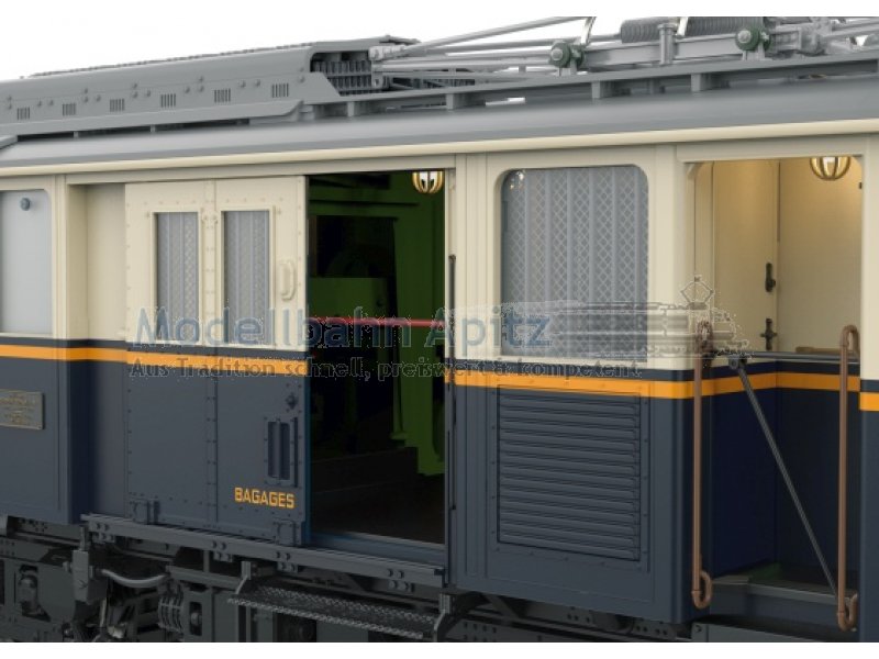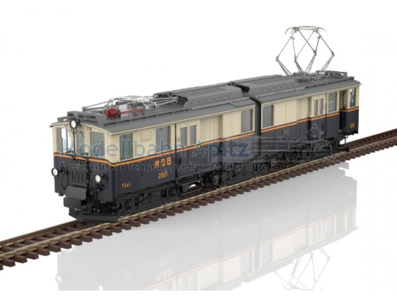 Gepäcktriebwagen FZe 6/6 der MOB in Metallausführung. In den 1930er-Jahren wurden für den äGolden Mountain Pullman Express“, welcher von der CIWL eingesetzt werden sollte, passende Lokomotiven für die steilen Strecken der MOB gesucht. Hier wurde entschieden, 2 elektrische Schlepptriebwagen mit Gepäckabteil zu erwerben. Sie hatten eine Leistung von mehr als 1100 PS und wurden von SIG / BBC hergestellt. Im Jahre 1932/1933 wurden die beiden Fahrzeuge unter der Baureihenbezeichnung FZe 6/6 mit den Betriebsnummern 2001 und 2002 in den Bestand der MOB eingereiht. Diese sechsachsigen Bo´Bo´Bo´ Triebwagen haben eine Länge über Puffer von 17 Metern und waren mit einer Höchstgeschwindigkeit von 60 km/h unterwegs. Sie gehörten damals zu den stärksten auf Meterspur verkehrenden Elektrolokomotiven der Welt! Eigentlich sollten die beiden Elektrotriebwagen die Luxuszüge ziehen, wurden aber bis auf wenige Fahrten nicht dafür eingesetzt, weil sich die Luxuszüge infolge der Weltwirtschaftskrise um 1930 keiner Nachfrage mehr erfreuten. So setzte die MOB die beiden Triebwagen im Güterverkehr ein. Im Laufe der Jahre haben die beiden Fahrzeuge mehrere Umzeichnungen und Umbauten erfahren. Gerade beim Bau des Hongrin-Staudamm Ende der 1960er -Jahre waren die beiden Schlepptriebwagen eine große Unterstützung, um den benötigten Zement von Montreux nach Allières zu bringen. Ende der 1980er-Jahre wurde der Triebwagen 2001 komplett zerlegt und sollte wieder in den Ursprungszustand zurückversetzt werden. Teile des Schlepptriebwagens, wurden in Montbovon hergerichtet. Für die betriebsfähige Aufarbeitung des 2002 wurden Teile des 2001 verwendet. Das Modell dieses Gelenktriebwagens wird nun im Maßstab 1:22,5 in Metall als Highend-Modell gefertigt. Das Modell ist wie von unseren anderen Highend-Modellen in einem sehr hohen Detailgrad. Farbgebung und Bedruckung in der Epoche II. Betriebsnummer 2001 der MOB. Epochen entsprechende Stromabnehmer und Dachaufbauten. Farbgebung und Bedruckung des FZe 6/6 2001 sind im Zustand seiner Ablieferung bei der SIG / BBC bzw. seiner Indienststellung bei der MOB um 1933 ebenso umgesetzt, wie die Stromabnehmer und Dachaufbauten.Ein mfx/DCC Sounddecoder mit verschiedenen Licht- und Soundfunktionen, wie z.B. dem Schweizer Lichtwechsel, einer Führerstands- und Innenbeleuchtung, digital heb- und senkbare Stromabnehmer und vieles mehr, sorgen für hohen Spielwert beim Betrieb des 76 cm langen Modells, welches auch den Radius R1 problemlos befahren kann.
