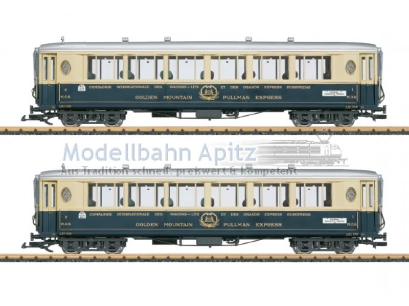 Personenwagen-Set bestehend aus zwei Wagen des Golden Mountain Pullman Express der CIWL, wie sie bei der MOB in den 30er-Jahren im Einsatz waren. Originalgetreue Farbgebung und Beschriftung der Epoche II. Komplette feindetaillierte Inneneinrichtung, Innenbeleuchtung serienmäßig eingebaut. Türen zum Öffnen. Metallradsätze. Länge über Puffer je Wagen 66 cm.