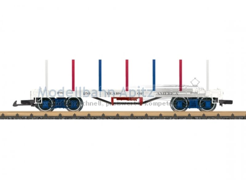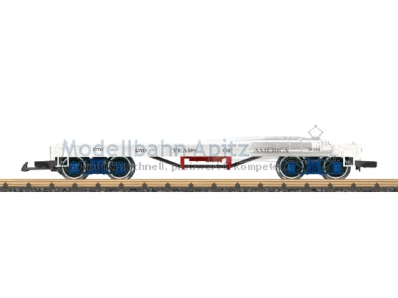 2026 wiederholt sich die Unterzeichnung der Unabhängigkeitserklärung in Amerika. Zu diesem Jubiläum bringt LGB ein Sonderwagen heraus. Flachwagen in den US-Farben gestaltet. Wagenboden aufwendig mit verschiedenen Bilder zum Thema Unabhänigkeit bedruckt. Passende Beladung der Liberty Bell. Beiligende Rungen in den US-Farben. Metallradsätze. Länge über Kupplung 42 cm.