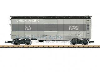 Modell eines gedeckten Express Service Güterwagens der Union Pacific. Silberne Farbgebung und Beschriftung der Epoche III. Viele angesetzte Details, seitliche Schiebetüren zum Öffnen. Metallradsätze.Länge über Kupplung 46 cm.