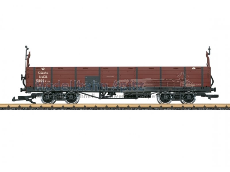 Modell eines offenen Güterwagens der Bauart OOw, wie er um 1916 bei der Königlich Sächsische Staatseisenbahn eingesetzt wurde. Betriebsnummer 5069 K. Detalierte rotbraune Farbgebung und Beschriftung der Epoche I. Metallradsätze. Länge über Puffer 48 cm.