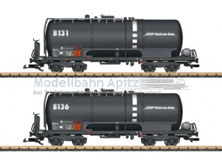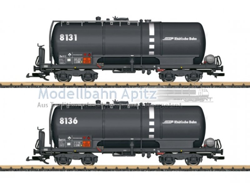 Kesselwagen-Set der RhB der Serie Za. Originalgetreue Farbgebung und Beschriftung der Epoche VI. Betriebsnummer Za 8131 und Za 8136. Der Kessel lässt sich befüllen und entleeren. Metallradsätze. Länge über Puffer pro Wagen 48 cm.