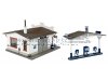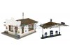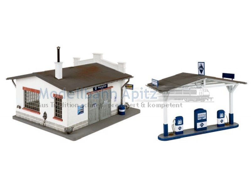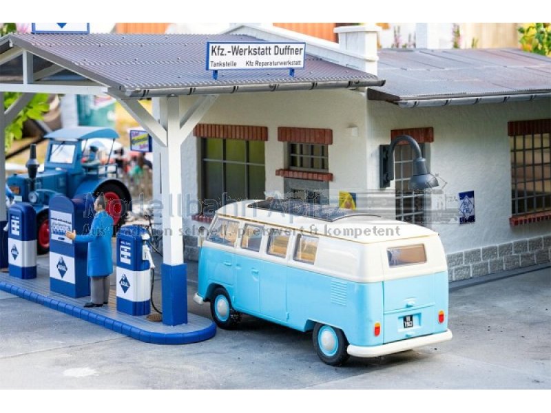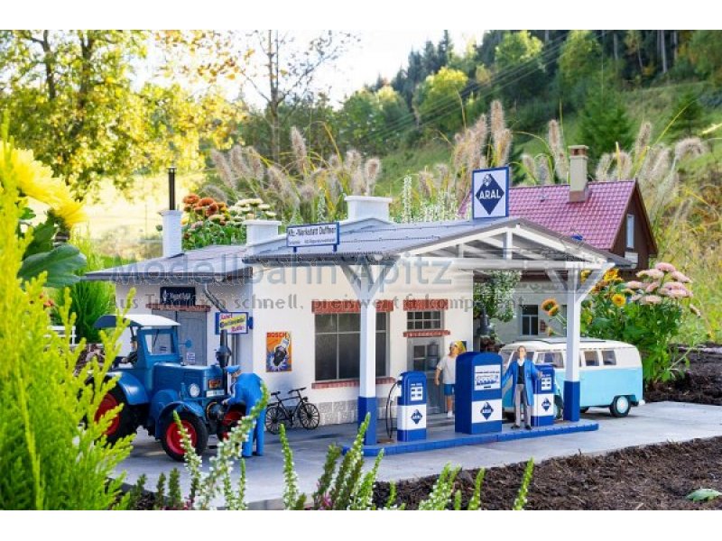 Volltanken bitte! Kleine ländliche Tankstelle mit überdachten Zapfsäulen und angeschlossener Werkstatt – idealer Haltepunkt am Straßenrand. Das weiß verputzte Gebäude mit roten Zierelementen aus Ziegeln verfügt über große Fenster und eine Toröffnung, die einen Blick in die eingerichtete Werkstatt gewähren. Vielfältige Details wie Fässer, ein Fahrrad und nostalgische Reklameschilder an den Wänden sorgen für ein nostalgisches Ambiente. Die überdachte Tankinsel mit zwei klassischen Zapfsäulen und einem Öldosenschrank im typischen BV-ARAL-Design macht die Szene komplett.