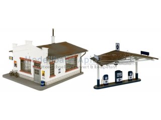 Volltanken bitte! Kleine ländliche Tankstelle mit überdachten Zapfsäulen und angeschlossener Werkstatt – idealer Haltepunkt am Straßenrand. Das weiß verputzte Gebäude mit roten Zierelementen aus Ziegeln verfügt über große Fenster und eine Toröffnung, die einen Blick in die eingerichtete Werkstatt gewähren. Vielfältige Details wie Fässer, ein Fahrrad und nostalgische Reklameschilder an den Wänden sorgen für ein nostalgisches Ambiente. Die überdachte Tankinsel mit zwei klassischen Zapfsäulen und einem Öldosenschrank im typischen BV-ARAL-Design macht die Szene komplett.