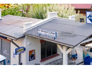 Volltanken bitte! Kleine ländliche Tankstelle mit überdachten Zapfsäulen und angeschlossener Werkstatt – idealer Haltepunkt am Straßenrand. Das weiß verputzte Gebäude mit roten Zierelementen aus Ziegeln verfügt über große Fenster und eine Toröffnung, die einen Blick in die eingerichtete Werkstatt gewähren. Vielfältige Details wie Fässer, ein Fahrrad und nostalgische Reklameschilder an den Wänden sorgen für ein nostalgisches Ambiente. Die überdachte Tankinsel mit zwei klassischen Zapfsäulen und einem Öldosenschrank im typischen BV-ARAL-Design macht die Szene komplett.