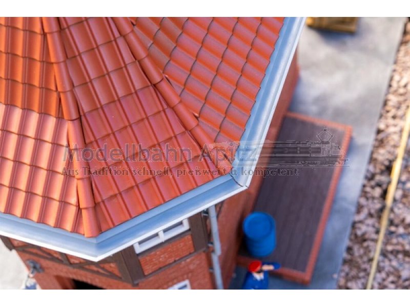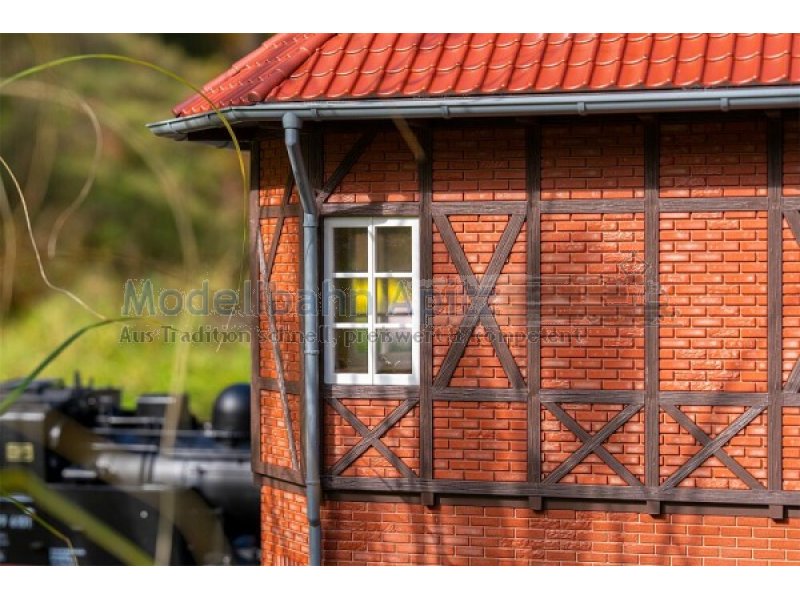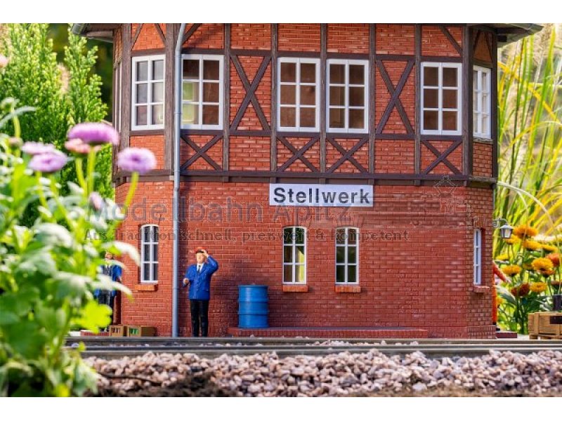 Dieses detailgetreue Stellwerk ist eine Nachbildung im Stil des Historismus, wie er für die eindrucksvollen Eisenbahnbauten des späten 19. und frühen 20. Jahrhunderts typisch war. Die Kombination aus robustem Backsteinmauerwerk im Erdgeschoss und dekorativem Fachwerk im Obergeschoss verleiht dem Gebäude seinen unverwechselbaren Charakter. Das markante, spitz zulaufende Mansardendach mit Fußwalm und filigranen Dachspitzen rundet die historische Optik ab und macht das Stellwerk zu einem echten Blickfang auf jeder Anlage. Große Fenster geben den Blick auf die umfangreiche Ausgestaltung des Hebelwerks im Inneren frei.