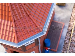Dieses detailgetreue Stellwerk ist eine Nachbildung im Stil des Historismus, wie er für die eindrucksvollen Eisenbahnbauten des späten 19. und frühen 20. Jahrhunderts typisch war. Die Kombination aus robustem Backsteinmauerwerk im Erdgeschoss und dekorativem Fachwerk im Obergeschoss verleiht dem Gebäude seinen unverwechselbaren Charakter. Das markante, spitz zulaufende Mansardendach mit Fußwalm und filigranen Dachspitzen rundet die historische Optik ab und macht das Stellwerk zu einem echten Blickfang auf jeder Anlage. Große Fenster geben den Blick auf die umfangreiche Ausgestaltung des Hebelwerks im Inneren frei.