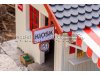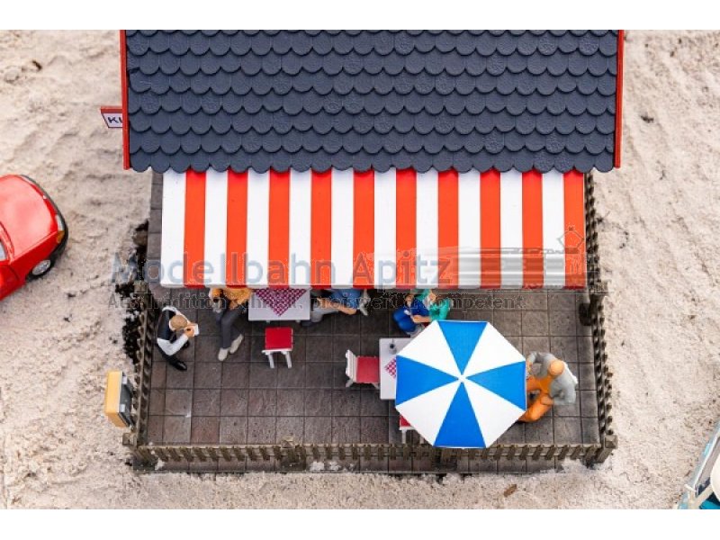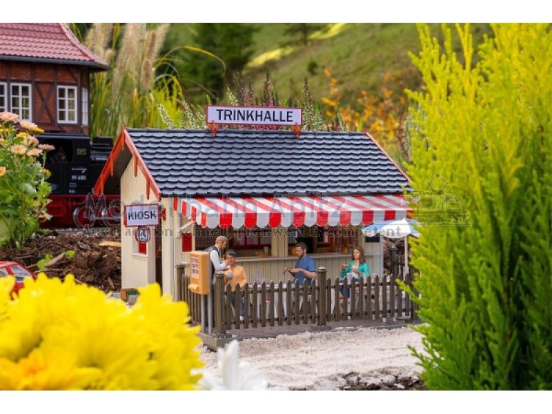 Geselliger Treffpunkt für eine kleine Pause auf dem Land! Das Modell überzeugt durch seine authentische Gestaltung mit heller Holzverkleidung, einem klassischen Satteldach mit dunklen Dachziegeln und einer markanten rot-weißen Markise über den großen Verkaufsfenstern.