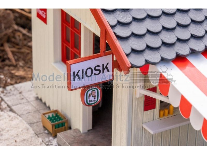 Durch die offene Theke blickt man direkt auf Flaschen, Gläser und kleine Snacks. Vor dem Kiosk sorgt der eingezäunte Biergarten mit weißen Gartenstühlen, Tischen und blau-weißem Sonnenschirm für gemütliche Atmosphäre. Liebevolle Details wie Getränkekisten, ein Zigarettenautomat und nostalgische Reklameschilder runden die Szene stimmungsvoll ab!