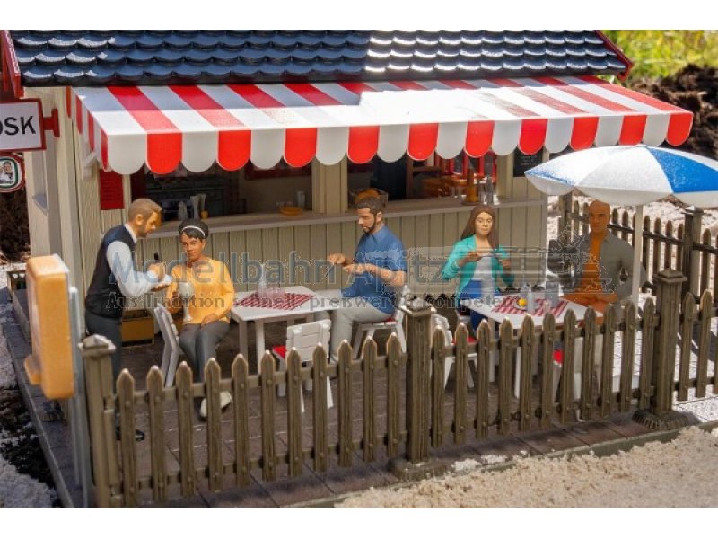 Essen, trinken, genießen! Fünf moderne Restaurantgäste und ein aufmerksamer Kellner bringen authentisches Leben in Ihre Szenen. Zwei Gäste greifen bereits zu Messer und Gabel, während eine Frau entspannt ihr Getränk genießt. Ein weiterer Gast lehnt sich zurück mit einem Bierkrug in der Hand. Der Kellner nimmt mit freundlichem Lächeln die Bestellung auf. Perfekt geeignet zur Gestaltung von Restaurants, Straßencafés oder Biergärten – für realistische Alltagsszenen in Ihrer Modellwelt.