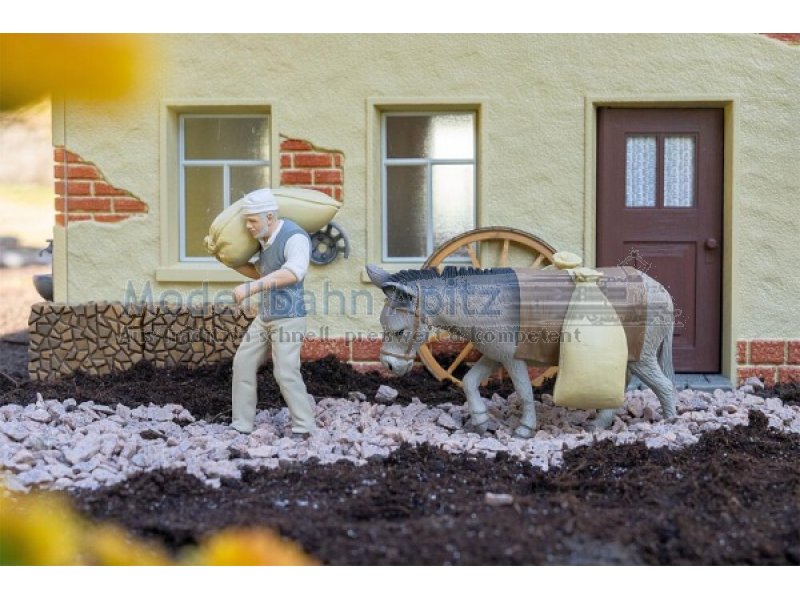 Tradition trifft auf Tatkraft! Der kräftige Müller mit charakteristischer Mütze und großem Mehlsack auf der Schulter bringt Bewegung in jede Szenerie. An seiner Seite ein geduldiger Esel, bepackt mit schweren Mehlsäcken, bereit für den nächsten Gang zur Mühle oder zum Markt. Die liebevoll gestalteten Figuren erzählen vom Alltag vergangener Zeiten und vom mühevollen Handwerk. Perfekt geeignet zur Ausgestaltung historischer Dorfidyllen, Bauernmärkte oder Mühlenszenen.