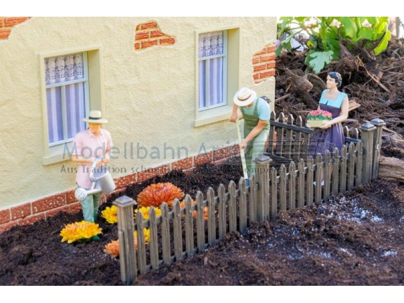 Arbeiten im Garten! Drei fleißige Hobbygärtner bei der Pflege ihrer grünen Oase! Ein Mann in Latzhose und Strohhut ist konzentriert bei der Arbeit mit dem Spaten – bereit, neue Beete anzulegen oder umzugraben. Eine Frau trägt stolz eine Kiste mit leuchtend roten Blumen, während ihre Kollegin mit Gießkanne und Gummistiefeln dafür sorgt, dass alles gut gedeiht. Mit liebevollen Details und sommerlicher Leichtigkeit bringen diese Figuren echtes Gartenleben auf jede Modellanlage – ideal zur Gestaltung von Vorgärten, Kleingartenanlagen oder Parkszenerien!