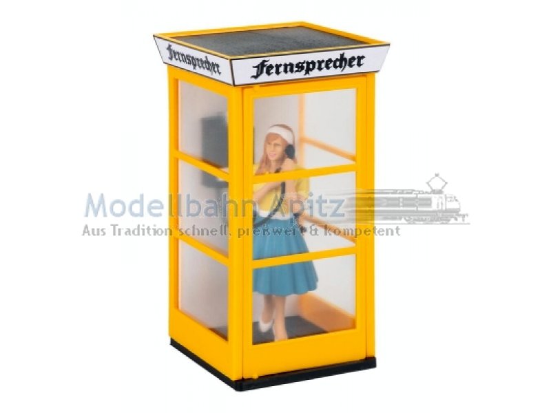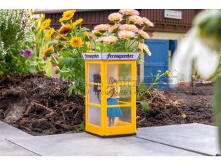 »Hallo?« - Leuchtend gelbe Telefonzelle mit drei verglasten Seiten und klassischem »Fernsprecher«-Schild in nostalgischer Schrift. Im Inneren steht eine liebevoll gestaltete Figur, den Hörer am Ohr, ganz ins Gespräch vertieft. Die beweglichen Türen lassen sich öffnen und schließen und verleihen der Szene zusätzliche Authentizität. Ideal als belebtes Detail am Straßenrand oder auf dem Dorfplatz, um eine Szene voller Nostalgie zu schaffen.