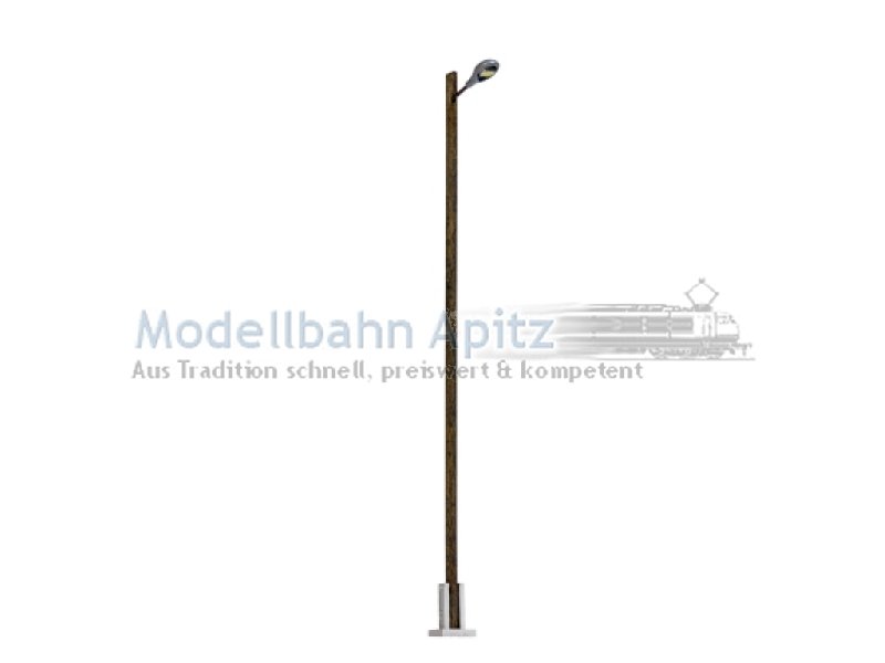 Universell einsetzbare Bahnhofsleuchte mit Mast aus echtem Holz. Auch für Industriegelände geeignet. Nachbildung der Betoneinfassung am Fuß der Lampe.