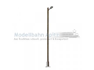 Universell einsetzbare Bahnhofsleuchte mit Mast aus echtem Holz. Auch für Industriegelände geeignet. Nachbildung der Betoneinfassung am Fuß der Lampe.