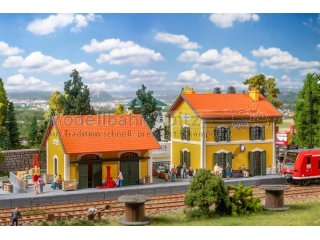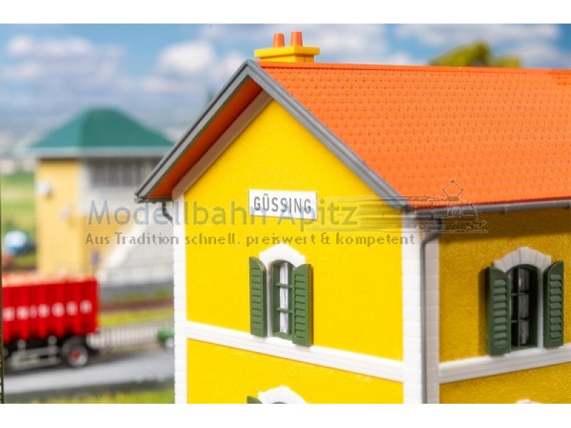 Während der nächste Modellzug gemächlich auf das Gleis einfährt, herrscht reges Miniatur-Treiben am Bahnhof Güssing! Der kleine zitronengelbe Bahnhof mit seinen dunkelgrünen Fensterläden und dem charmanten roten Ziegeldach fügt sich nahtlos in die unterschiedlichsten Landschaften ein. Farblich inspiriert vom realen Bahnhof Güssing in Österreich, setzt auch das Modell mit seinem leuchtenden Anstrich fröhliche Akzente auf der Modellanlage!