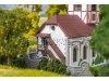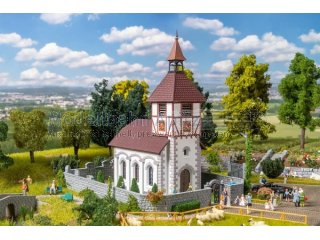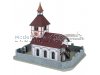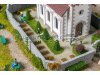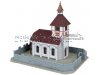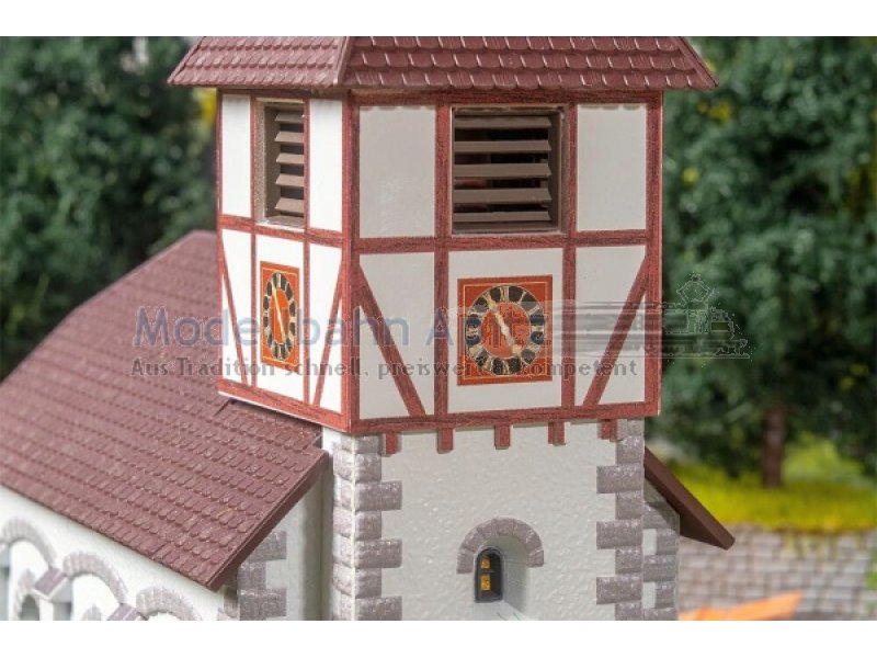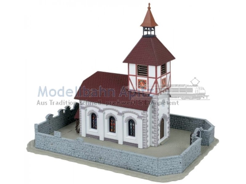 Eine lauschige Dorfkirche mit weißem Putz, grauen Steinrändern und braunen Ziegeln reckt ihren Kirchturm über die Miniaturdächer hinaus und schaut ruhig und andächtig über den kleinen Fried- und Innenhof, der sie umgibt. Ein rustikales Holztor und ein Treppenaufgang öffnen den Weg in die von einer schützenden Steinmauer umgebene Kirche.