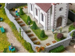 Eine lauschige Dorfkirche mit weißem Putz, grauen Steinrändern und braunen Ziegeln reckt ihren Kirchturm über die Miniaturdächer hinaus und schaut ruhig und andächtig über den kleinen Fried- und Innenhof, der sie umgibt. Ein rustikales Holztor und ein Treppenaufgang öffnen den Weg in die von einer schützenden Steinmauer umgebene Kirche.