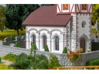 Eine lauschige Dorfkirche mit weißem Putz, grauen Steinrändern und braunen Ziegeln reckt ihren Kirchturm über die Miniaturdächer hinaus und schaut ruhig und andächtig über den kleinen Fried- und Innenhof, der sie umgibt. Ein rustikales Holztor und ein Treppenaufgang öffnen den Weg in die von einer schützenden Steinmauer umgebene Kirche.