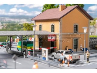 Dieses sandsteinfarbene Gebäude mit klassischem Satteldach und Steinverzierungen an den Hausecken erinnert an die typischen Grenzkontrollposten vergangener Jahrzehnte. Der dazugehörige Grenzübergang umfasst zwei überdachte Schranken – jeweils für Ein- und Ausfahrt – und lässt sich flexibel gestalten: Eine der Schranken kann mithilfe einer Halterung direkt am Gebäude angebracht werden.