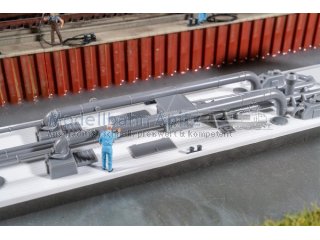 Ein Tankschiff für die Binnenschifffahrt! Dieses Modell eines Tankschiffs bringt authentisches Hafen- und Industrieflair auf jede Anlage. Der abgeflachte Rumpf, das Steuerhaus und das Rohrleitungssystem an Deck sorgen für den industriellen Touch. Zwei beiliegende Holzcontainer ergänzen die Szenerie. Wasserlinienmodell – nicht schwimmfähig – dafür aber ideal zur Ausgestaltung realistischer Wasserszenerien im Modell.