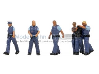 Fünf Polizisten in dunkelblauer Uniform sind im Einsatz: Zwei von ihnen nehmen einen Gefangenen fest, während die Übrigen konzentriert ihrer jeweiligen Aufgabe nachgehen. Eine perfekte Szene für realistische Einsätze auf der Modellanlage.