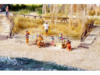 Vier Erwachsene und zwei Kinder genießen einen sonnigen Tag am Strand. Während die Kinder eifrig an der beiliegenden Sandburg bauen, macht es sich der Großvater entspannt im Liegestuhl bequem. Die Eltern unterstützen die Kleinen beim Bauen, und die Großmutter gönnt sich in aller Ruhe eine kleine Leckerei.