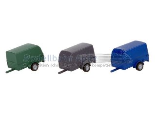Drei Auto-Anhänger in verschiedenen Farben – perfekt zum Ausgestalten von Lade- oder Parkplätzen.