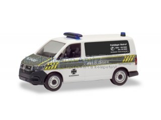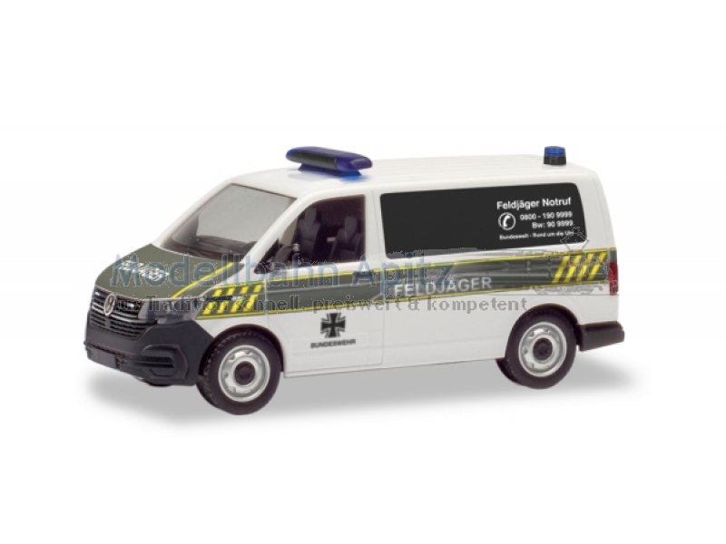 Mit der aktuellen weißen Grundfarbe setzt Herpa den aktuellen VW T 6.1 als Feldjäger-Fahrzeug der Bundeswehr als Miniaturmodell um. |