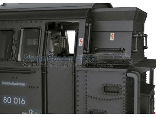 Vorbild: Tenderlokomotive Baureihe 80 der Deutschen Bundesbahn. Ausführung mit drei Kesselaufbauten, Läutewerk und Turbodynamo links, Rauchkammertüre ohne Zentralverschluss mit Nummernschild mittig. Tiefschwarze Grundfarbgebung. Betriebsnummer 80 016. Betriebszustand um 1953.