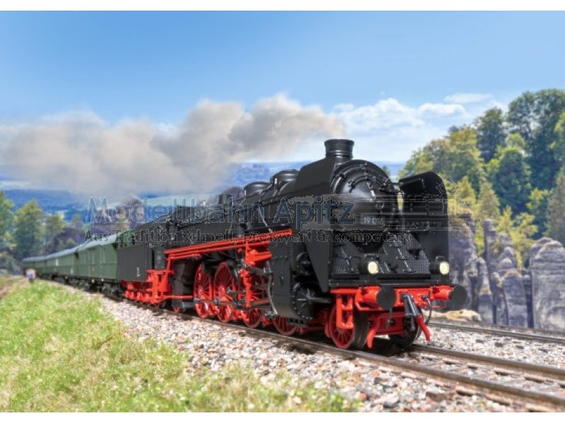 Vorbild: Schnellzug-Dampflokomotive Baureihe 19.0 Sachsenstolz (Sächsische Gattung XX HV), mit sächsischem Kohlen-Schlepptender 2´2 T31. Deutsche Reichsbahn der DDR (DR/DDR). Mit großen Windleitblechen. Lok-Betriebsnummer 19 016. Betriebszustand Epoche IIIa, Anfang der 1950er Jahre.