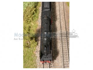Modell: Mit Digital-Decoder mfx+ und umfangreichen Geräuschfunktionen. Geregelter Hochleistungsantrieb mit Schwungmasse im Kessel. 4 Achsen angetrieben. Haftreifen. Lokomotive und Tender weitgehend aus Metall. Serienmäßig eingebauter Raucheinsatz, mit geschwindigkeitsabhängigem, dynamischem Rauchausstoß. Fahrtrichtungsabhängig wechselndes Zweilicht-Spitzensignal konventionell in Betrieb, digital schaltbar. Führerstandbeleuchtung und Feuerbüchsenflackern jeweils separat digital schaltbar. Beleuchtung mit wartungsfreien warmweißen und roten Leuchtdioden (LED). Mit Pufferspeicher. Schwenkbare Führerstandtüren und Imitation der Vorhänge zwischen Führerstand und Tender. Kurzkupplung mit Kinematik zwischen Lok und Tender. Am Tender kinematikgeführte Kurzkupplung mit NEM-Schacht. Pufferhöhe an Lok und Tender nach NEM. Befahrbarer Mindestradius R2 437,5 mm. Kolbenstangenschutzrohre und Bremsschläuche liegen bei. Länge über Puffer 26,0 cm.