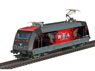 Vorbild: Schnellzuglokomotive Baureihe 101 mit einer Sondergestaltung zum Wacken Open Air (W:O:A®). Betriebszustand 2026. Modell: Mit Digital-Decoder mfx+ und umfangreichen Geräuschfunktionen. Geregelter Hochleistungsantrieb. 4 Achsen angetrieben. Haftreifen. Fahrtrichtungsabhängig wechselndes Dreilicht-Spitzensignal und 2 rote Schlusslichter konventionell in Betrieb, digital schaltbar. Fernscheinwerfer separat schaltbar. Führerstandbeleuchtung digital schaltbar. Spitzenlicht an Lokseite 2 und 1 jeweils separat digital abschaltbar. Wenn Spitzensignal an beiden Lokseiten abgeschaltet ist, dann beidseitige Funktion des Doppel-A-Lichts. Beleuchtung mit wartungsfreien warmweißen und roten Leuchtdioden (LED). Mit Pufferspeicher zur Überbrückung von kurzen stromlosen Stellen. Kulissengeführte Kupplung. Länge über Puffer 21,9 cm.
