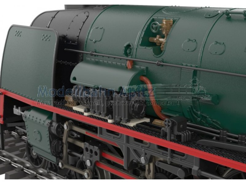 Modell: Digital-Decoder mfx+ mit Licht- und Geräuschfunktionen. Geregelter Hochleistungsantrieb mit Schwungmasse im Kessel. Eine Achse angetrieben, zwei Achsen über Kuppelstange angetrieben. Haftreifen. Lokomotive und Tender weitgehend aus Metall. Serienmäßig eingebauter Rauchgenerator, mit geschwindigkeitsabhängigem, dynamischem Rauchausstoß. Stirnseitiges Zweilicht-Spitzensignal digital schaltbar. Zusätzlich sind die Führerstandbeleuchtung und das Feuerflackern in der Feuerbüchse separat digital schaltbar. Beleuchtung mit wartungsfreien warmweißen und roten Leuchtdioden (LED). Mit Pufferspeicher. Verstellbare Kupplung mit Kinematik zwischen Lok und Tender. Am Tender kinematikgeführte Kurzkupplung mit NEM-Schacht. Uneingeschränkte Kurvengängigkeit der Lok im Radius 437,5 mm (Radius 2). Bremsschläuche, Schraubenkupplungsimitation und Signalhalter liegen bei. Länge über Puffer ca. 28,4 cm