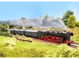 Modell: Mit Digital-Decoder mfx+ und umfangreichen Geräuschfunktionen. Geregelter Hochleistungsantrieb mit Schwungmasse im Kessel. Eine Achsen angetrieben, drei Achsen über Kuppelstange angetrieben. Haftreifen. Lokomotive und Tender weitgehend aus Metall. Serienmäßig eingebauter Rauchgenerator mit geschwindigkeitsabhängigem, dynamischem Rauchausstoß. Fahrtrichtungsabhängig wechselndes Zweilicht-Spitzensignal konventionell in Betrieb, digital schaltbar. Führerstandbeleuchtung, Feuerbüchsenflackern und Fahrwerkbeleuchtung separat digital schaltbar. Beleuchtung mit wartungsfreien warmweißen und roten Leuchtdioden (LED). Mit Pufferspeicher. Kurzkupplung mit Kinematik zwischen Lok und Tender. Am Tender kinematikgeführte Kurzkupplung mit NEM-Schacht. Pufferhöhe an Lok und Tender nach NEM. Befahrbarer Mindestradius 437,5 mm. Mit leichten Einschränkungen in Radius 1 fahrfähig. Kolbenstangenschutzrohre und Bremsschläuche liegen bei. Länge über Puffer ca. 31 cm.