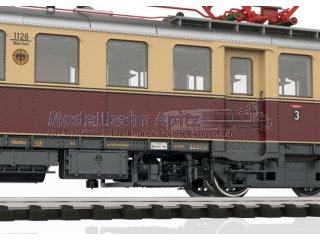 Vorbild: Elektrischer Triebwagen elT mit Steuerwagen elS der Deutschen Reichsbahn-Gesellschaft (DRG). Ausführung mit Fronttüren am Triebwagen und Steuerwagen mit stirnseitigen Übergangsblechen. Oben angebrachte Zugschlusssignal-Laternen. Anordnung der Sandkästen im Ablieferungszustand. Farbgebung in beige/weinrot. Betriebsnummern elT 1126 und elS 2126. Steuerwagen elS mit Laufschild äNach Ismaning - Nach München Ost Pbf“. Heimatbahnhof München. Betriebszustand 1932.