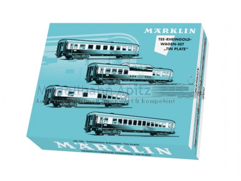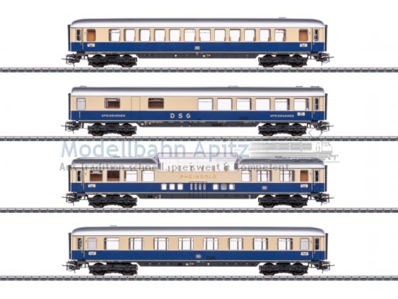 Vorbild: 4 vierachsige TEE-Reisezugwagen unterschiedlicher Bauarten der Deutschen Bundesbahn (DB). Kobaltblau/beige Rheingold-Farbgebung. 1 TEE-Großraumwagen Ap4üm-62, 1. Klasse. 1 TEE-Speisewagen WR4üm-64, 1. Klasse. 1 TEE-Aussichtswagen AD4üm-62, 1. Klasse. 1 TEE-Abteilwagen Av4üm-62, 1. Klasse. Betriebszustand um 1962. Modell: Alle Wagen mit Relex-Kupplungen und Gummiwulst-Übergängen. Aufgedruckte Zuglaufschilder. Unterschiedliche Betriebsnummern. Abteilwagen serienmäßig mit eingebauter Zugschlussbeleuchtung. Jeder Wagen in gekennzeichnetem Karton einzeln verpackt, in Anlehnung an die historische Verpackungsgestaltung der damaligen Zeit. Zusätzliche Umverpackung. Länge über Puffer je Wagen 24 cm.