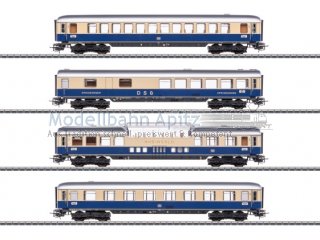 Vorbild: 4 vierachsige TEE-Reisezugwagen unterschiedlicher Bauarten der Deutschen Bundesbahn (DB). Kobaltblau/beige Rheingold-Farbgebung. 1 TEE-Großraumwagen Ap4üm-62, 1. Klasse. 1 TEE-Speisewagen WR4üm-64, 1. Klasse. 1 TEE-Aussichtswagen AD4üm-62, 1. Klasse. 1 TEE-Abteilwagen Av4üm-62, 1. Klasse. Betriebszustand um 1962.