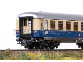 Vorbild: 4 vierachsige TEE-Reisezugwagen unterschiedlicher Bauarten der Deutschen Bundesbahn (DB). Kobaltblau/beige Rheingold-Farbgebung. 1 TEE-Großraumwagen Ap4üm-62, 1. Klasse. 1 TEE-Speisewagen WR4üm-64, 1. Klasse. 1 TEE-Aussichtswagen AD4üm-62, 1. Klasse. 1 TEE-Abteilwagen Av4üm-62, 1. Klasse. Betriebszustand um 1962. Modell: Alle Wagen mit Relex-Kupplungen und Gummiwulst-Übergängen. Aufgedruckte Zuglaufschilder. Unterschiedliche Betriebsnummern. Abteilwagen serienmäßig mit eingebauter Zugschlussbeleuchtung. Jeder Wagen in gekennzeichnetem Karton einzeln verpackt, in Anlehnung an die historische Verpackungsgestaltung der damaligen Zeit. Zusätzliche Umverpackung. Länge über Puffer je Wagen 24 cm.