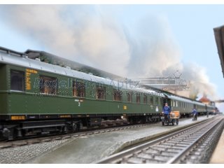 Modell: Detaillierte Ausführung im vollen Längenmaßstab. Befahrbarer Mindestradius 360 mm. Drehgestelle der Bauart Görlitz II schwer für die Wagen der Einheitsbauart 1928-30, sowie Schwanenhals-Drehgestelle für den der Bauart 1923 Hecht. Aufstiegsleitern und angesetzte Griffstangen. Teilweise mehrfarbige Inneneinrichtungen. Aufgedruckte Wagenlaufschilder und Ordnungsnummern. Kurze Faltenbälge liegen zum Tausch bei. Wagen der Bauart 1928-30 vorbereitet für den Einbau stromführender Kurzkpplungen 72024, LED-Innenbeleuchtung 73410/73411 und Schleifer 73406. Wagen der Bauart 1923 Hecht vorbereitet für den Einbau der stromführenden Kurzkupplungen 72022, LED-Innenbeleuchtung 73410/73411 und Schleifer 73404. Alle Wagen einzeln verpackt in zusätzlicher Umverpackung. Gesamtlänge über Puffer ca. 97 cm.Gleichstromradsatz für Wagen Bauart 1928-30: E700600.Gleichstromradsatz für Wagen Bauart 1923 Hecht: E700580.