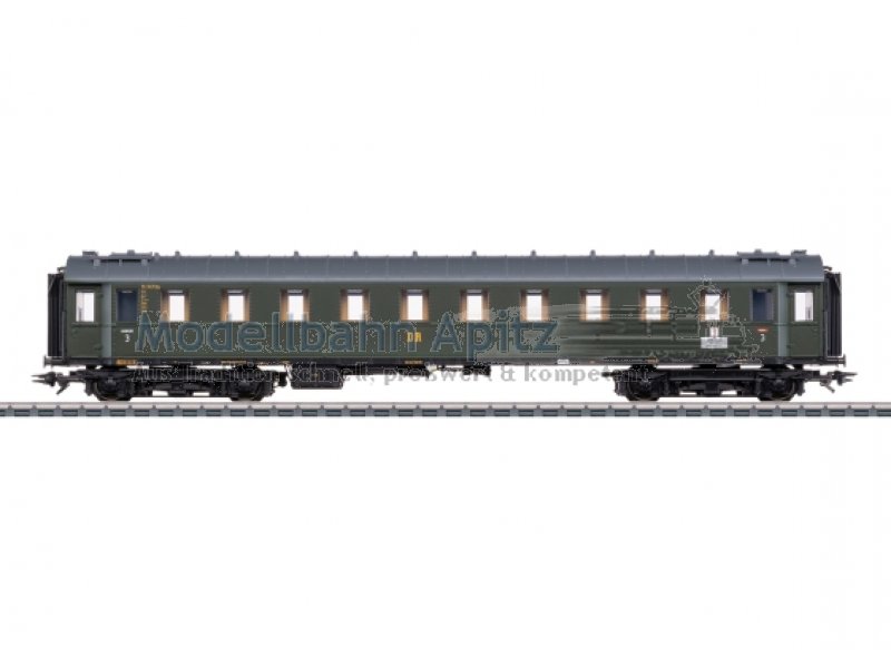Vorbild: Schnellzugwagen C4ü (C4ü-28), 3. Klasse, Einheitsbauart 1928-30 der Deutschen Reichsbahn der DDR (DR/DDR). Ordnungsnummer 3. Zuglauf für den Schnellzug D 11: Dresden-Warnemünde. Flaschengrüne Grundfarbgebung. Betriebszustand Epoche IIIa, Anfang der 1950er Jahre. Modell: Detaillierte Ausführung im vollen Längenmaßstab. Befahrbarer Mindestradius 360 mm. Drehgestelle der Bauart Görlitz II schwer. Aufstiegsleitern und angesetzte Griffstangen. Mehrfarbige Inneneinrichtung. Aufgedruckte Wagenlaufschilder und Ordnungsnummern. Kurzer Faltenbalg liegt zum Tausch bei. Vorbereitet für den Einbau stromführender Kurzkpplungen 72024, LED-Innenbeleuchtung 73410/73411 und Schleifer 73406. Länge über Puffer 25 cm.Gleichstromradsatz E700600.