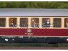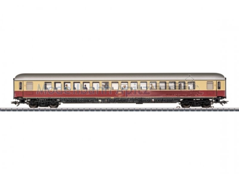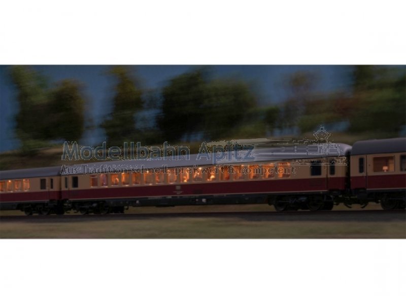 Vorbild: 1. Klasse Schnellzug-Großraumwagen Bauart Apümh 121 der Deutschen Bundesbahn (DB). Purpurrot/Beige Grundfarbgebung. Betriebszustand um 1975. Modell: Mit Digital-Decoder mfx. Mit beweglicher, digital schaltbarer Schaffnerfigur im Mittelgang. Serienmäßig eingebaute LED-Innenbeleuchtung, trennbare stromführende Kupplungen und Zugschlussbeleuchtung am Wagenende 1 und 2 jeweils separat digital schaltbar. Beleuchtung mit wartungsfreien Leuchtdioden (LED). Mit Pufferspeicher. Schleifer ist montiert. Typspezifisch gestalteter Unterboden und Schürze. Mit Drehgestellen nach Bauart Minden-Deutz schwer, vorbildentsprechend mit Scheibenbremsen, Magnetschienenbremse und angesetzten Generatoren. Inneneinrichtung mit Figuren. Gesamtlänge über Puffer 28,2 cm.