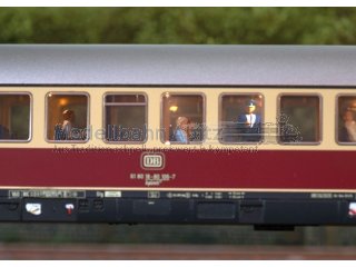 Modell: Mit Digital-Decoder mfx. Mit beweglicher, digital schaltbarer Schaffnerfigur im Mittelgang. Serienmäßig eingebaute LED-Innenbeleuchtung, trennbare stromführende Kupplungen und Zugschlussbeleuchtung am Wagenende 1 und 2 jeweils separat digital schaltbar. Beleuchtung mit wartungsfreien Leuchtdioden (LED). Mit Pufferspeicher. Schleifer ist montiert. Typspezifisch gestalteter Unterboden und Schürze. Mit Drehgestellen nach Bauart Minden-Deutz schwer, vorbildentsprechend mit Scheibenbremsen, Magnetschienenbremse und angesetzten Generatoren. Inneneinrichtung mit Figuren. Gesamtlänge über Puffer 28,2 cm.