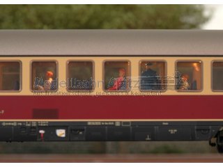 Modell: Mit Digital-Decoder mfx. Mit beweglicher, digital schaltbarer Schaffnerfigur im Mittelgang. Serienmäßig eingebaute LED-Innenbeleuchtung, trennbare stromführende Kupplungen und Zugschlussbeleuchtung am Wagenende 1 und 2 jeweils separat digital schaltbar. Beleuchtung mit wartungsfreien Leuchtdioden (LED). Mit Pufferspeicher. Schleifer ist montiert. Typspezifisch gestalteter Unterboden und Schürze. Mit Drehgestellen nach Bauart Minden-Deutz schwer, vorbildentsprechend mit Scheibenbremsen, Magnetschienenbremse und angesetzten Generatoren. Inneneinrichtung mit Figuren. Gesamtlänge über Puffer 28,2 cm.