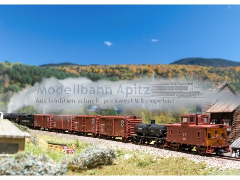 Passende US-Güterwagen-Sets finden Sie im Märklin H0-Sortiment unter der Artikelnummer 45667 und im Trix H0-Sortiment unter der Artikelnummer 24915 mit dem Hinweis auf die benötigten Tauschradsätze. Die passende Dampflokomotive Berkshire finden Sie unter der Artikelnummer 37983.